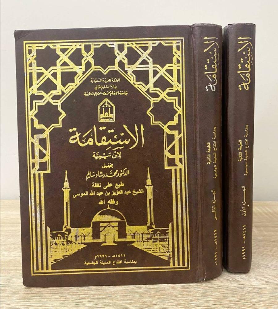 يبين في كتاب "الاستقامة" منهج الحق والاعتدال في العقيدة والشريعة، ومفهوم الاستقامة في الأقوال والأفعال، ويرد على بعض الآراء الصوفية الخاطئة، مؤكدًا على ضرورة اتباع الكتاب والسنة في كل ما يتعلق بالأسماء والصفات والتوحيد، ويبيّن أن الانحراف والضلال إنما يحدثان بسبب ترك بعض أحكام الشرع.